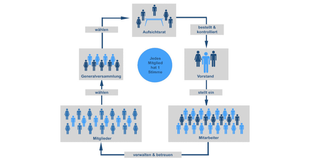 Mit einem Vorstand und einem Aufsichtsrat hat die Genossenschaft eine klare Leitungs- und Kontrollstruktur. Sie ist eine demokratische Rechts- und Unternehmensform. Jedes Mitglied hat eine Stimme – unabhängig von der Höhe der Kapitalbeteiligung. Kleine Genossenschaften mit bis zu 20 Mitgliedern können auf einen Aufsichtsrat verzichten.