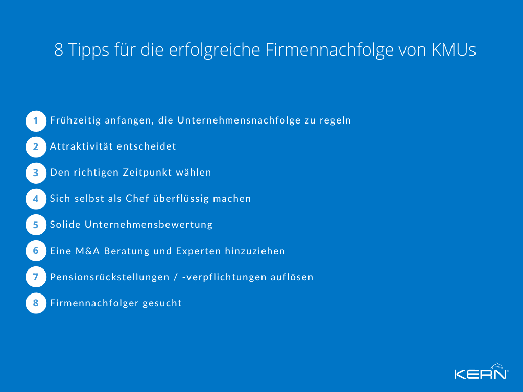 Viele Klein- und Mittelständische Unternehmen (KMU - bis zu 249 MA respektive Umsatz bis 50 Mio. €) stehen vor der Herausforderung, einen geeigneten Nachfolger zu finden und die Firma in guten Händen zu wissen. Wir haben acht wertvolle Tipps für KMUs, die bei der Firmennachfolge beachtet werden sollten.